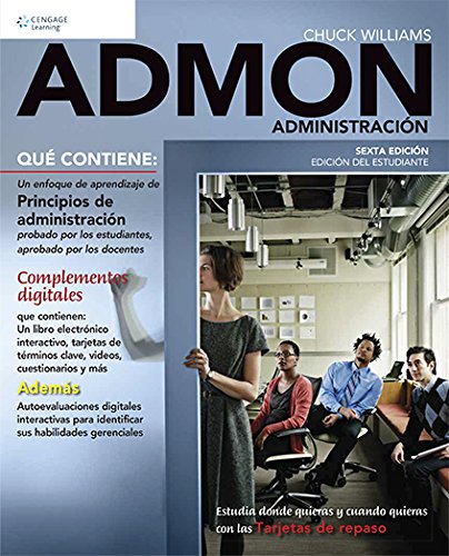 Creado a través de un proceso de revisión “probado por los estudiantes – aprobado por los docentes” con la participación de estudiantes y profesores, ADMON es una solución atractiva y accesible para dar cabida a los diversos estilos de vida de los estudiantes. Este enfoque innovador une las últimas investigaciones sobre la administración de hoy con un enfoque de narración único del autor Chuck Williams en una gran riqueza visual y profesional, en un diseño que se lee como una revista de negocios. ADMON proporciona un formato simplificado, conceptos impulsados con ejercicios opcionales, nuevos casos y aplicaciones prácticas que se pueden utilizar o no en función de las necesidades de los alumnos. El conjunto completo de ayudas para el aprendizaje incluye tarjetas de términos clave descargables, videos y cuestionarios que permiten a los alumnos estudiar dondequiera que estén y siempre que tengan tiempo. Además, la herramienta de participación de los estudiantes los ayudará a “pensar como gerentes”. Esta herramienta permite manejar fácilmente las dinámicas sutiles de enseñar los principios de la administración, con.